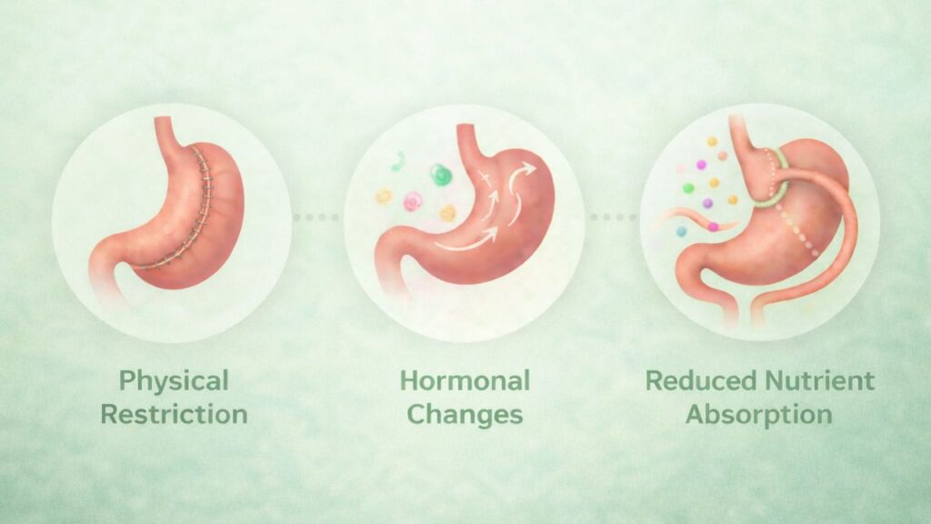 Weight loss surgery alters hunger hormones, helping reduce appetite and improve feelings of fullness after smaller meals.